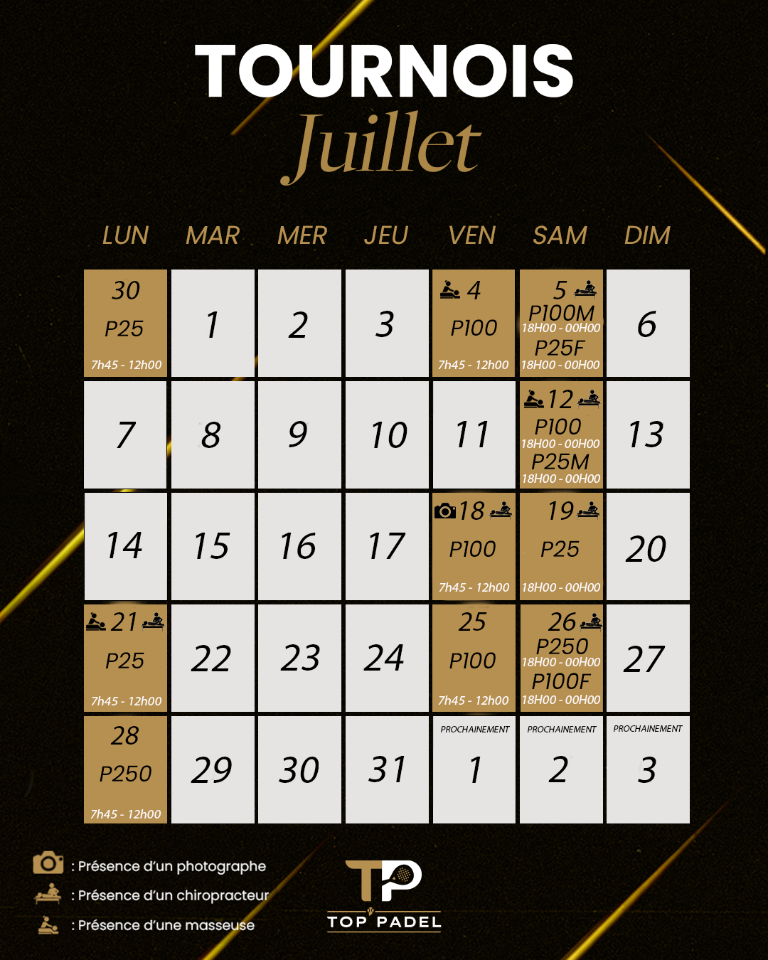 Ces événements de padel vous permettent de travailler votre technique, développer vos stratégies de jeu, et vous mesurer à d’autres joueurs de votre niveau dans un cadre à la fois compétitif et convivial. Après chaque session, une boisson offerte vous attend pour échanger avec d’autres joueurs passionnés dans une ambiance amicale et détendue.