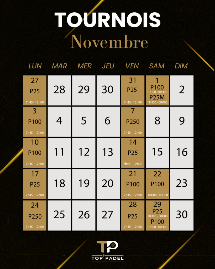 Retrouvez ici le planning des tournois homologués pour le mois de novembre et decembre 2025 !