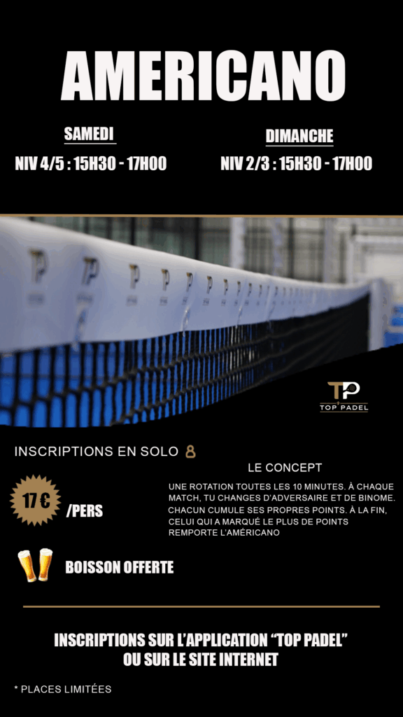 L’Americano est un format de jeu dynamique et accessible à tous les niveaux. L’objectif est de cumuler un maximum de points en jouant avec différents partenaires tout au long de la session.