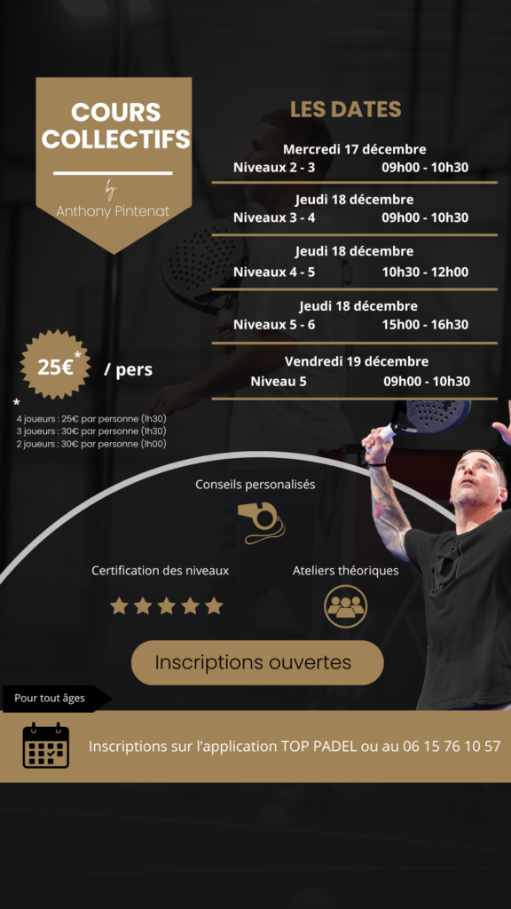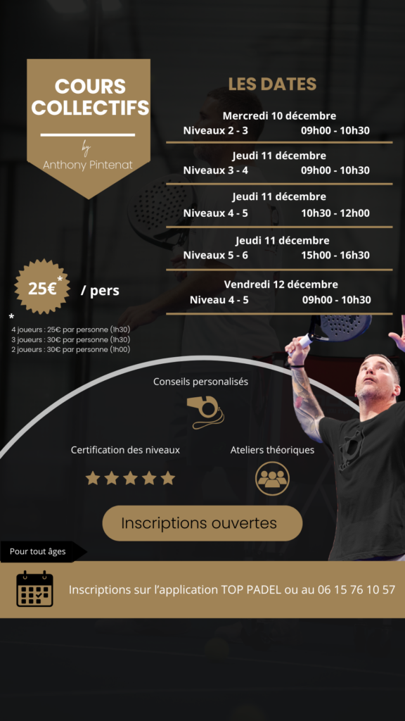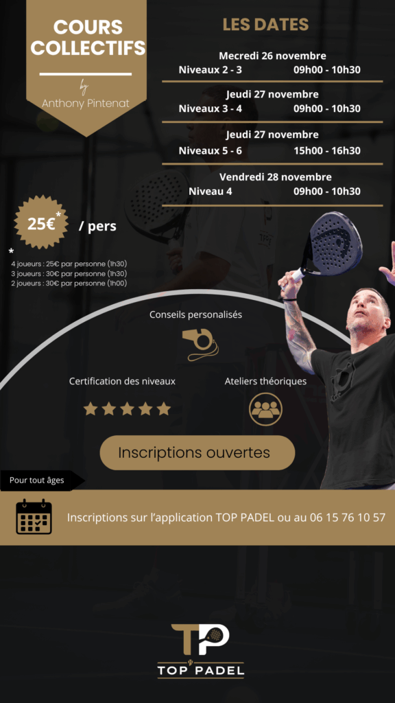 ➡️ Rendez-vous sur l’application Top Padel, rubrique “Cours collectifs”, pour réserver votre pack.
