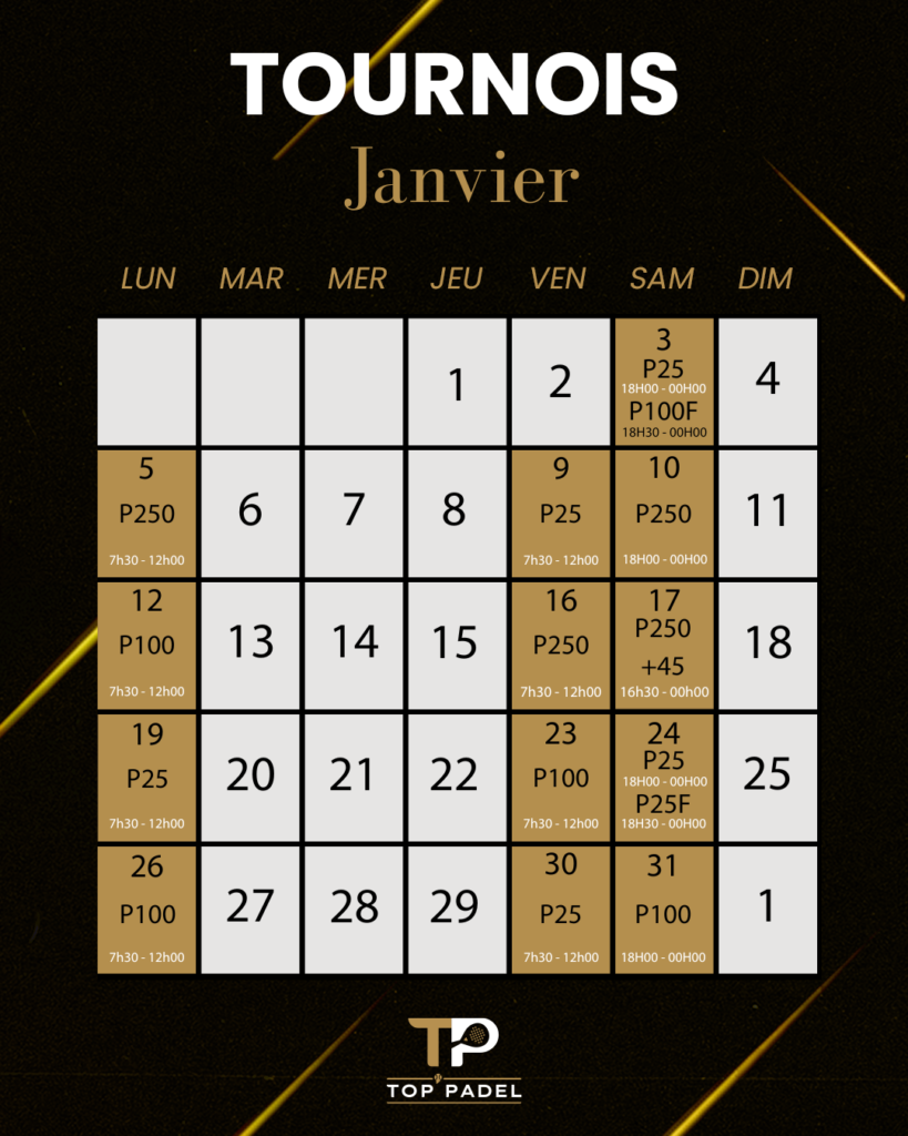 Retrouvez ici le planning des tournois homologués pour le mois de decembre et janvier 2025 !