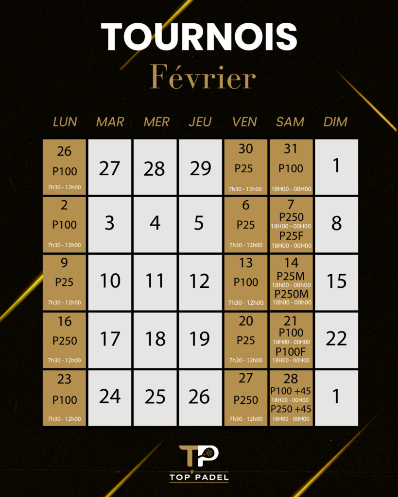 Retrouvez ici le planning des tournois homologués pour le mois de février et mars 2026 !