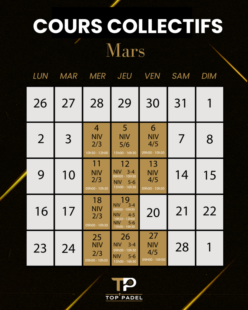 ➡️ Via l’application Top Padel, rubrique Cours collectifs